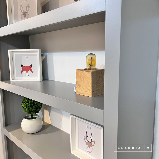 Biblioteca realizada en MDF enchapada en madera paraíso o laqueada en diferentes colores (blanco, negro, gris, humo, verde, cora, hielo y regata).