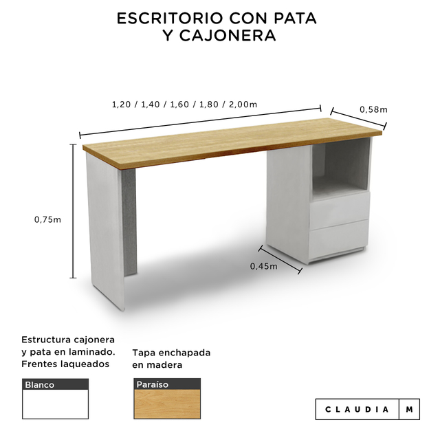 Incluye tapa de 1.80x0.60m laqueada color blanco o enchapada en paraiso y se puede combinar con 2 patas laqueadas en color blanco o 1 pata laqueada blanca con cajonera laqueada blanca o con frentes paraiso o 2 cajoneras. Tambien se puede elegir el modelo de la cajonera de 2 cajones y 1 hueco o 3 cajones (El precio varia segun la eleccion realizada)