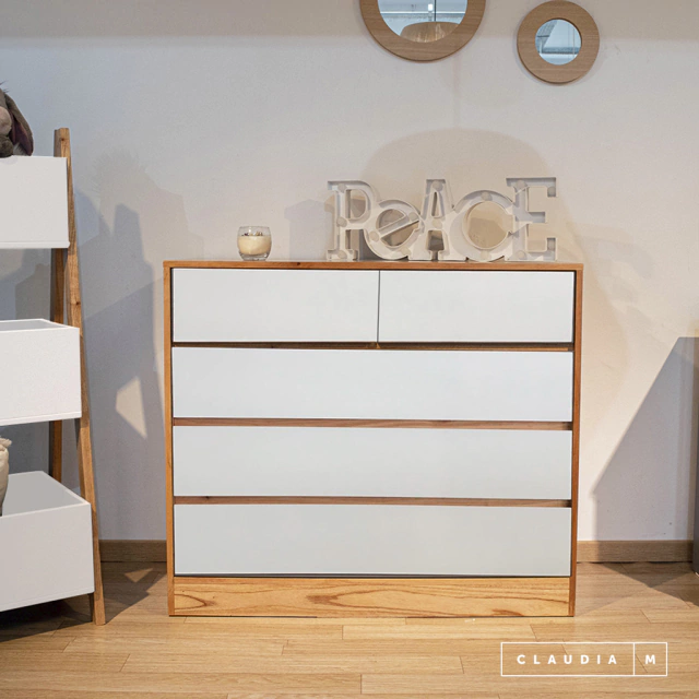 La cómoda Dante tiene la estructura enchapado en madera de paraíso, con los frentes en MDF laqueados en color blanco, negro o gris.