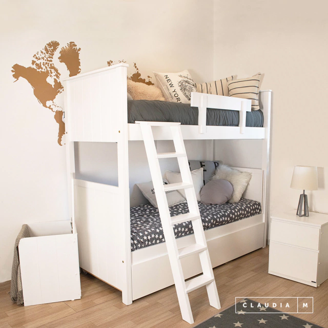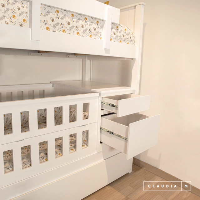 Una vez que se deja de usar la cuna funcional, se convierte en una cucheta tradicional. Sumando una mesa de luz con guías telescópicas y una baulera.
