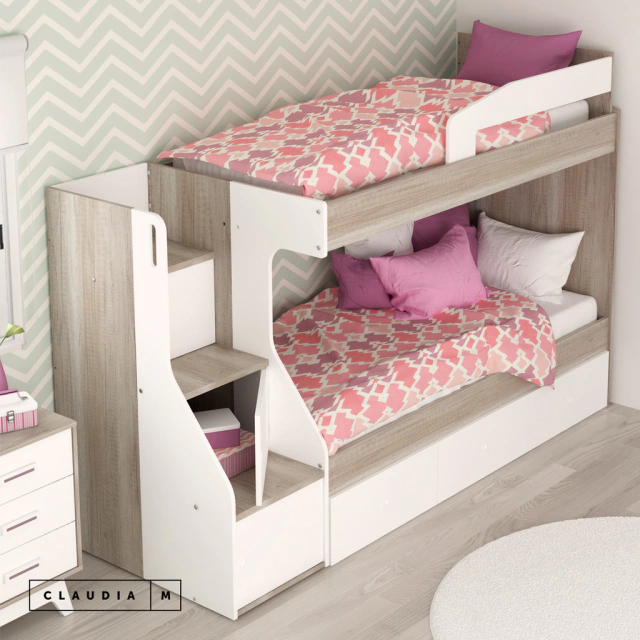 Apta para dos colchones de 1,90 x 0,80 mts. La cama cuenta con una escalera de cubos muy resistente que posee 3 compartimientos de guardado con puertas, una escalera segura y de muy fácil acceso. Puede venir con 3 cajones individuales terminados en laminado blanco con rueditas inferiores para armar o con carro cama. Sus grandes dimensiones generan un gran espacio de guardado, ideal para organizar el espacio de los más pequeños. La baranda de grandes dimensiones da seguridad al niño que duerma en la cama superior. La cama está terminada en laminado serrano (color madera) y laqueado blanco. Se realiza únicamente en los colores blanco y serrano.