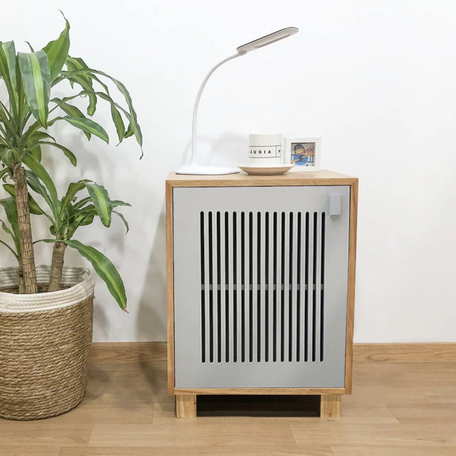 Mesa de luz con estructura en MDF, enchapada en paraíso con puerta laqueada en color blanco, gris, negro, verde, cora, hielo, humo o regata.