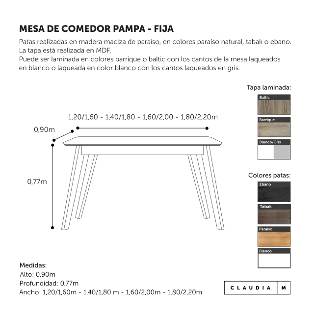 Patas realizadas en madera maciza de paraíso, en colores paraíso natural, tabak o ebano. La tapa está realizada en MDF.