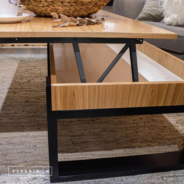 Mesa ratona de centro con tapa levadiza y un gran espacio de guardado interior. Con estructura en MDF enchapada en paraíso con patas en MDF laqueado, color blanco o negro.